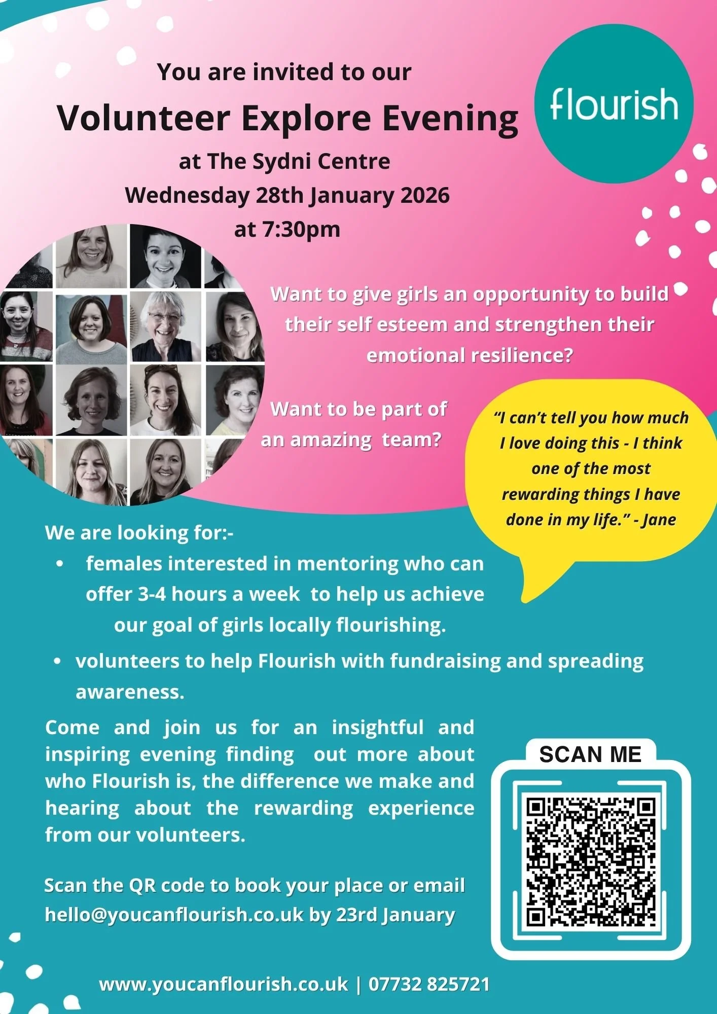 Our next Explore Evening on 28th January 2026 is a chance to come along, meet the team and learn more about volunteering with us. The evening will give insight into the work we do, the incredible impact we have and the range of way volunteers can get involved. We are looking for females interested in mentoring who can offer 4 hours a week to offer direct support to girls. We are also looking for volunteers to support with Fundraising and spreading awareness.